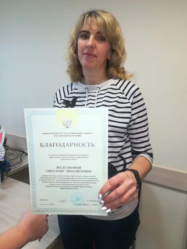 Желудковой Светлане Михайловне - социальному работнику отделения социального обслуживания на дому граждан пожилого возраста и инвалидов № 4 Областного бюджетного учреждения социального обслуживания «Комплексный центр социального обслуживания населения Курчатовского района и города Курчатова» Курской области.