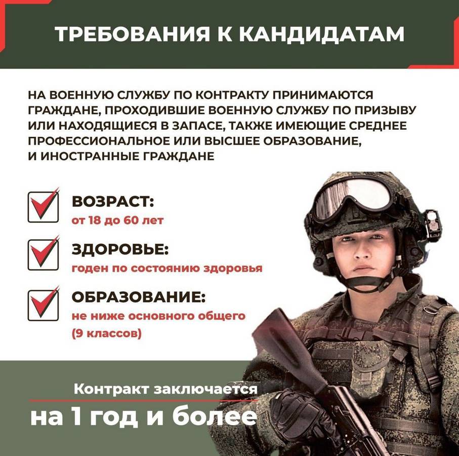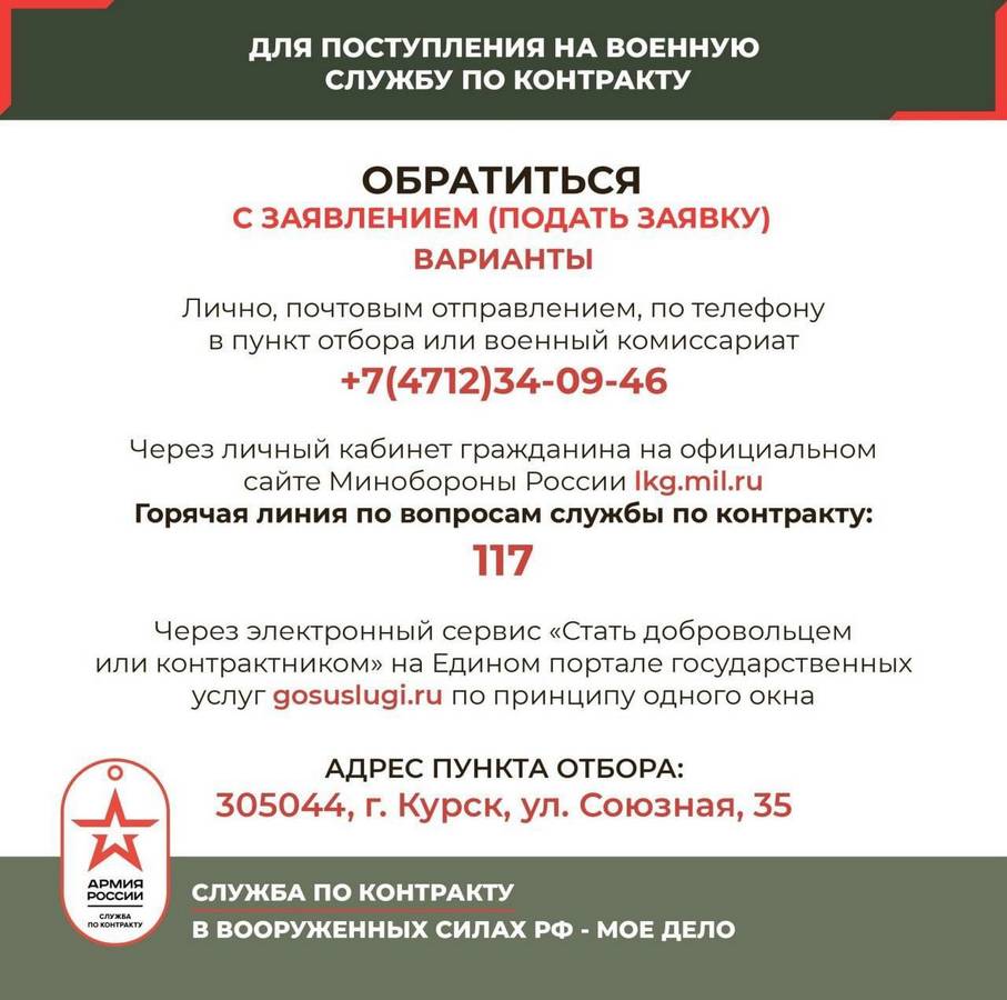 В Курской области продолжается отбор на военную службу по контракту. В карточках подробная информация о том, какие требования предъявляют к кандидатам, какие выплаты и льготы получают контрактники и куда нужно обратиться для подачи заявления.