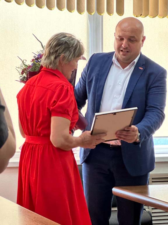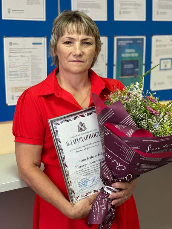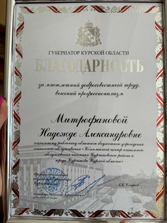 Благодарностью Губернатора Курской области «За многолетний и добросовестный труд в системе социальной защиты населения Курской области», отмечена социальный работник ОБУСО «КЦСОН Курчатовского района и города Курчатова» Митрофанова Надежда Александровна. В торжественной обстановке награду вручил врио министра ЖКХ и ТЕК Курской области Мулевин Александр Владимирович. В Комплексном центре Надежда Александровна трудится более 22 лет.