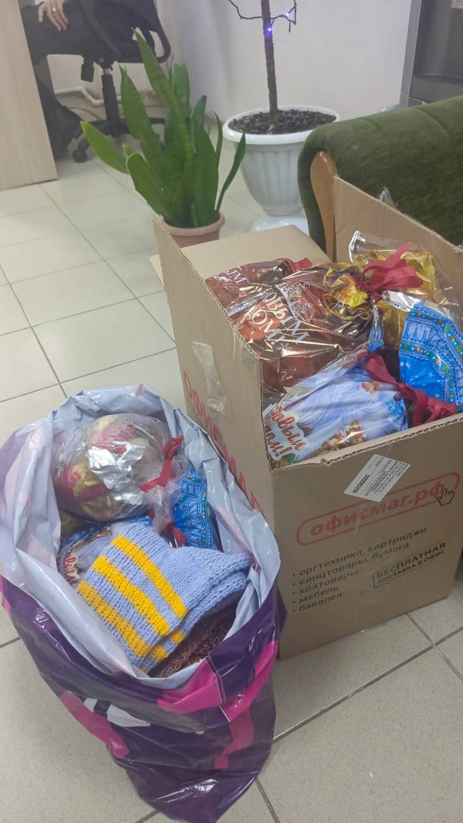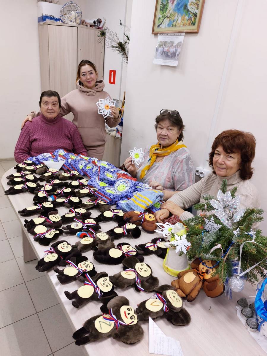 В преддверии Нового года получатели услуг отделения Активного долголетия, созданного на базе ОБУСО «КЦСОН Курчатовского района и города Курчатова», приготовили новогодние подарки, собранные с любовью, вдохновляющие бойцов на Победу. Чебурашки, сшитые руками бабушек, их носят как талисманы, прикалывают к рюкзакам и бронежилетам, новогодние письма-пожелания для бойцов, сладкие угощения, тёплые вязанные носки и рукавицы передали в волонтёрский центр села Дичня.