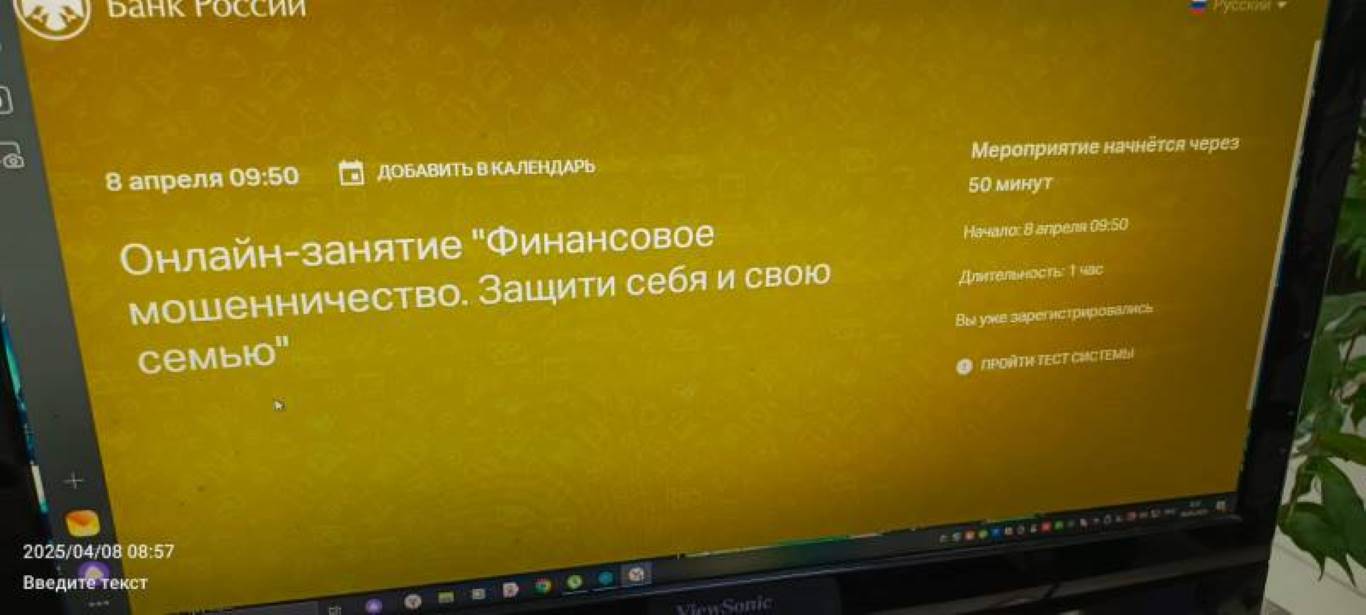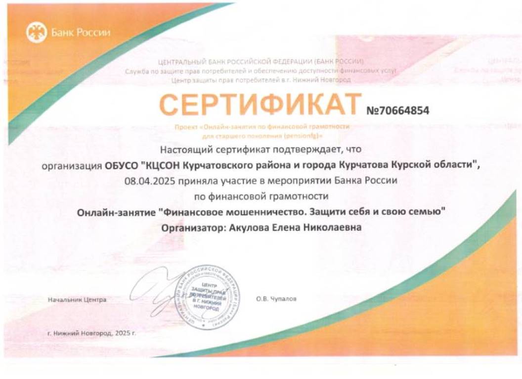 8 апреля получатели услуг отделения «Активное долголетие», приняли участие в мероприятии Банка России по финансовой грамотности. Тема онлайн-занятия «Финансовое мошенничество. Защити себя и свою семью».