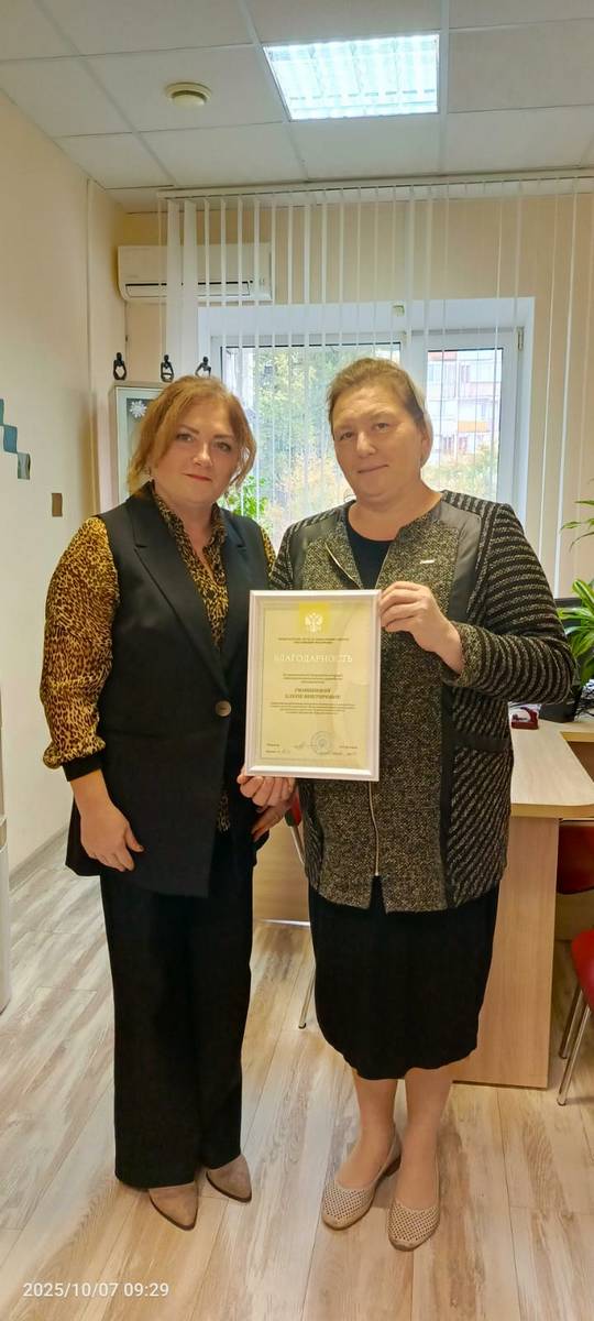 Благодарность Министерства труда и социальной защиты Российской Федерации. за многолетний безупречный труд, образцовое выполнение служебных обязанностей, профессиональное мастерство и вклад в решение задач по выработке и реализации государственной политики, нормативно-правовому регулированию в социально-трудовой сфере, награждены, заместитель директора ОБУСО «КЦСОН Курчатовского района и города Курчатова» Машкина Татьяна Владимировна и социальный работник отделения социального обслуживания на дому № 7, Рюшина Елена Викторовна.