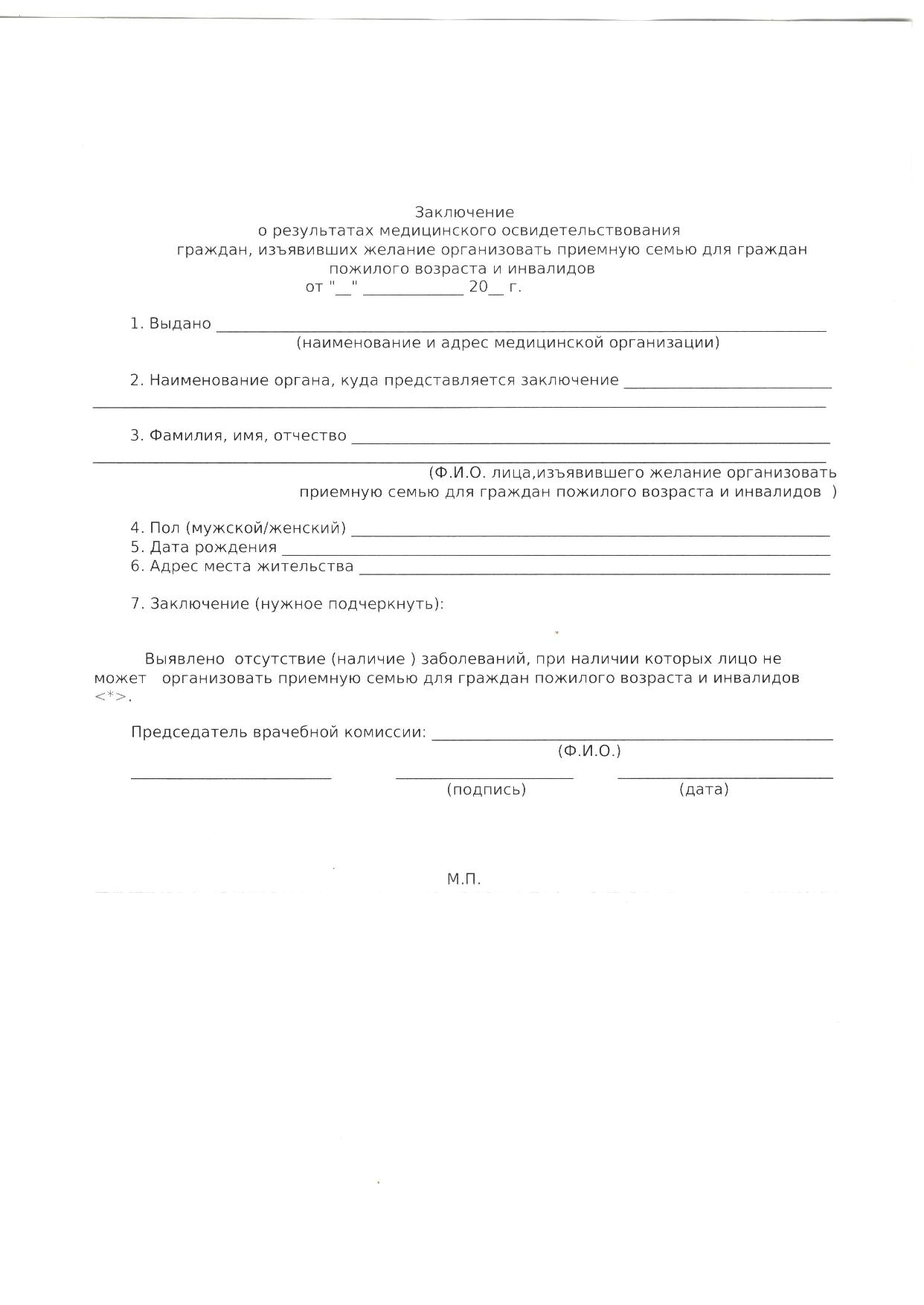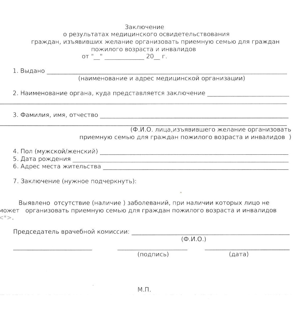 Бланк медицинской справки (Заключение о результатах медицинского освидетельствования граждан, изъявивших желание организовать приемную семью для граждан пожилого возраста и инвалидов)